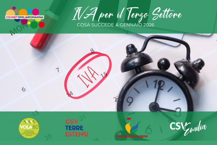 Il corso “IVA per il Terzo settore : cosa succede a gennaio 2026” si terrà martedì 9 dicembre in modalità, organizzato da CSV VolontaRomagna, in collaborazione con CSV Emilia, CSV Terre Estensi e CSV Volabo ed è rivolto a tutti i volontari dell’Emilia Romagna.