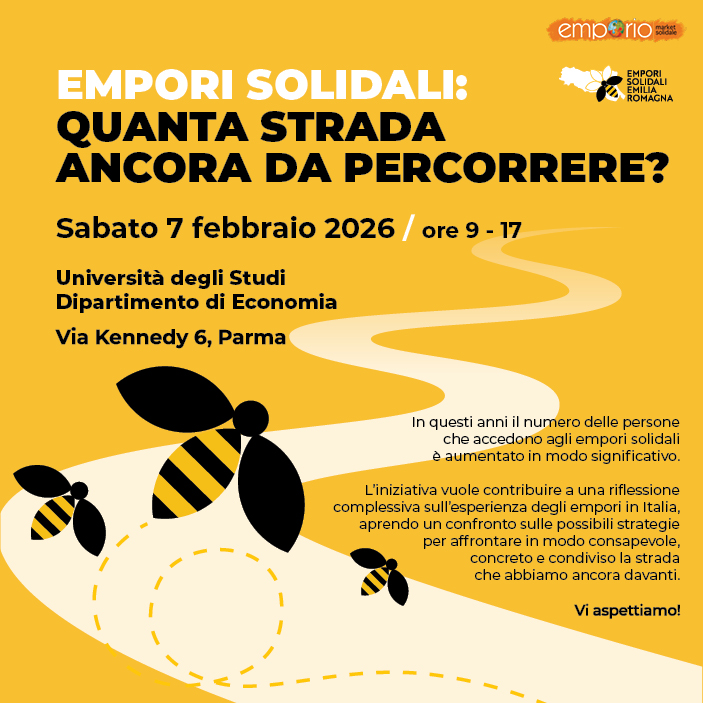 Una riflessione a 360° sull’esperienza degli empori solidali a livello nazionale: Empori Solidali Emilia Romagna Odv e Market Solidale di Parma sono i promotori del convegno “Empori solidali: quanta strada ancora da percorrere?” in programma il 7 febbraio 2026 presso l’Università di Parma, una riflessione a 360° sull’esperienza degli empori solidali a livello Nazionale.  L’evento rientra nel progetto “Facciamo squadra contro la povertà” finanziato dalla Regione Emilia Romagna, parteciperà ai saluti introduttivi l’Assessora ad Agenda digitale, Legalità, Contrasto alle povertà Elena Mazzoni.