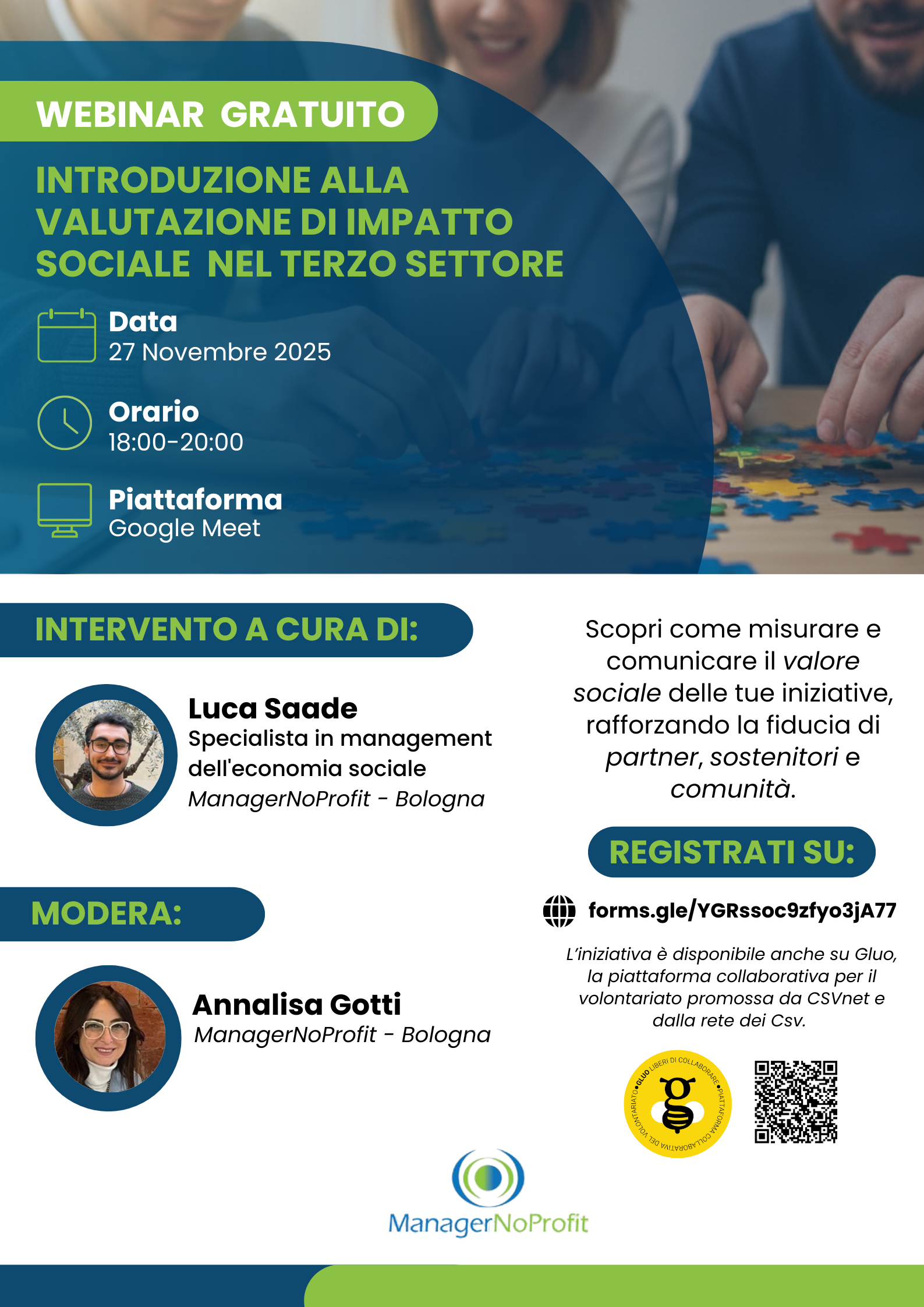 “Introduzione alla Valutazione di Impatto Sociale nel Terzo Settore”, è un webinar gratuito promosso da ManagerNoProfit ODV – sezione Emilia-Romagna, che si terrà giovedì 27 novembre, dalle 18:00 alle 20:00 su Google Meet.